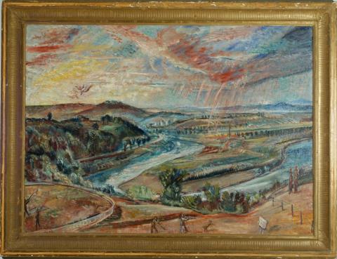 From a painting point of view, this work demonstrates the influence of French painting and in particular Cézanne, in the layering of the masses and the directional brushstrokes, in which light and colour form an unreal kaleidoscope. Nature is transfigured to the point of becoming expressive, beyond the real datum. The critic Bardi wrote, perhaps while observing this painting, "One day [---] we will notice the genuine contribution of Ferrazzi's personality to the creation of the new painting in Italy, and we will start from the skies, from his grave and solemn skies as on Judgement Day, from the clouds that cloud over the earth in a mixture of storm and greatness, of the infinite and the apocalyptic, of lightning and the sun, cycles that unleash a fury of beauty and enchantment" (P. M. Bardi, Ferrazzi inedito, in "Stile", 23 May 1943, p. 31).