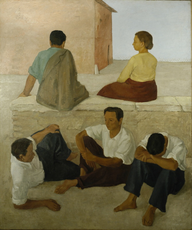 Cavalli es el pintor de la dulzura de la vida". Así describía el crítico Waldemar George la obra de Emanuele Cavalli en 1933. Como a muchos, le llamó la atención la gracia y la exquisitez de sus obras, en las que los sujetos son captados en momentos suspendidos y cristalizados, como en el cuadro Meriggio: cuatro hombres y una mujer son representados durante una pausa del sol de verano, en las horas más calurosas del día. Parecen unidos al compartir un momento fuera del tiempo, pero no interactúan y parecen aislados en sus propios pensamientos.