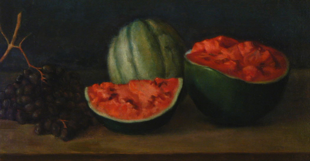 En Natura morta con cocomero (Naturaleza muerta con sandía) vemos plasmada su concepción de la pintura, inspirada en Caravaggio, Courbet y Cézanne: dos sandías están colocadas en primer plano y la carne roja de la abierta contrasta eficazmente con los tonos oscuros de alrededor, incluida la negrura del racimo de uvas de la izquierda. El cuadro fue realizado en los primeros años de la posguerra, durante la ausencia del artista de la escena expositiva, ya que no participó en ninguna exposición entre 1945 y 1952, aunque siguió pintando. Es, pues, un testimonio de los años de madurez artística de Sócrate, un periodo en el que, según Briganti, "[...] quizá ya no encontró, así lo creo, la justa medida de esa manera de casar lo antiguo con la 'vie moderne' en el clima de un naturalismo cortés y sensible". Hay claras referencias a la tradición de las naturalezas muertas, en particular la del siglo XVII, un género muy presente en su producción artística.
