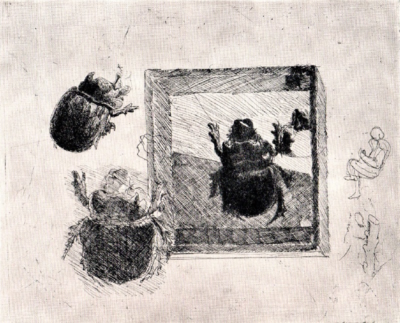 Bartolini está considerado entre los mejores grabadores italianos contemporáneos, junto con Giorgio Morandi y Giuseppe Viviani. Las obras que se presentan en esta sección han sido realizadas por el artista con la técnica del aguafuerte, que consiste en grabar una plancha de metal con ácido nítrico, que luego se entinta para producir reproducciones sobre papel. Los temas de los grabados de Bartolini, siempre figurativos, están tomados del mundo real, pero a veces en composiciones fantásticas, y abarcan desde el microcosmos de los objetos, los insectos, las plantas, los detalles, hasta la figura humana y el paisaje. En este caso se trata de un estudio del escarabajo Hércules, especie exótica conocida por su magnífica fuerza y su considerable tamaño. En la hoja, el escarabajo está representado tres veces en diferentes posiciones, mientras que esbozados a un lado, a la derecha, hay una figura humana y un tronco de árbol, lo que sugiere una prueba temprana de grabado. El ejemplar central del escarabajo está dentro de un marco cuadrangular de bordes gruesos. La marca que caracteriza a ésta, así como a otras obras de Bartolini, muestra una habilidad pictórica en el uso de la técnica, en algunos casos con ligeros sombreados y ligeras investigaciones, otras veces con una marca más acentuada y oscura. Este grabado fue realizado por el artista durante el periodo de exilio al que fue relegado por el régimen fascista. Entre las publicaciones en las que aparece la obra se encuentra el catálogo de la exposición Luigi Bartolini. Líneas de libertad, celebrada en la Academia de Bellas Artes de Roma en 2019.