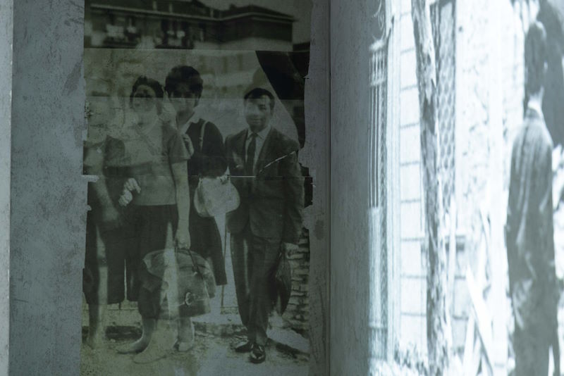 Además de las proyecciones de documentos históricos, la exposición recurre constantemente a collages fotográficos que aparecen como impresos directamente en las paredes.