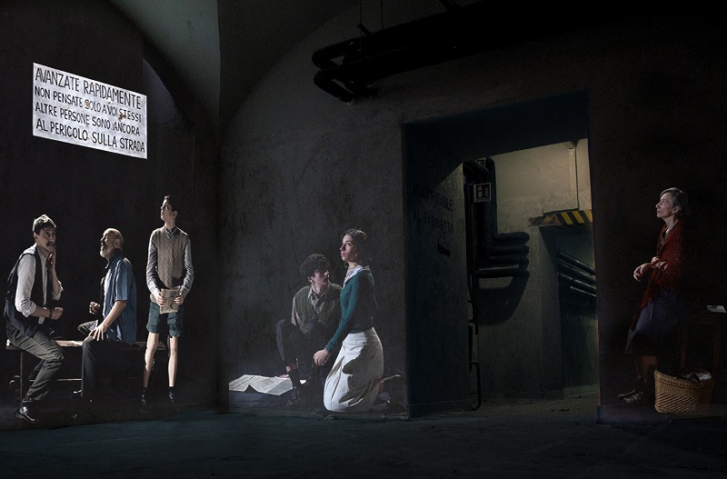 Una serie de proyecciones describe la doble perspectiva de los que bombardean y desde arriba no perciben los efectos, y los de abajo, que sufren las consecuencias. En el suelo fluyen imágenes de Roma vista desde los aviones en vuelo durante un bombardeo, mientras que en las paredes se proyecta la ciudad en escombros.