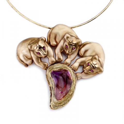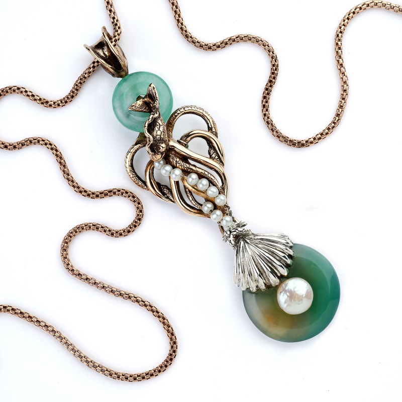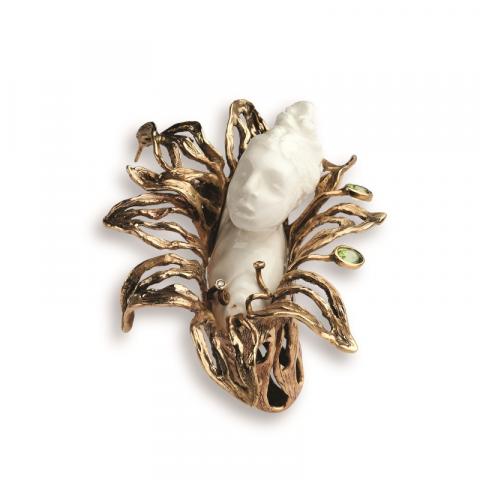 Si tratta di pezzi unici, realizzati a cera persa in oro, bronzo e argento e con pietre preziose e semipreziose dai tagli rari e particolarissimi o con elementi in porcellana modellata dalla stessa artista.