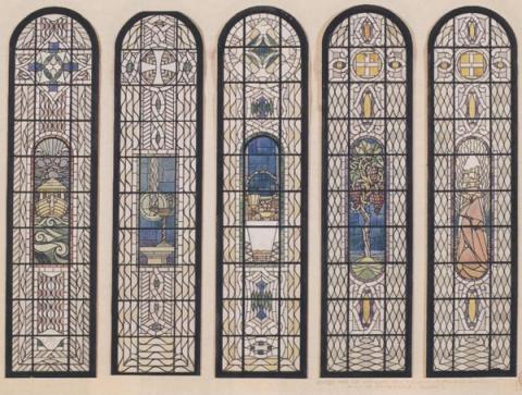Le vetrate realizzate nel 1927 da Cesare Picchiarini per la sala da pranzo, sono costituite, ciascuna, da due ante con lunetta.