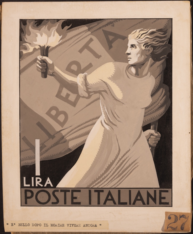 3. La terza sezione presenta una serie di bozzetti per la realizzazione di francobolli celebrativi dell’Italia Democratica e della rivista Italia Filatelica. Sono esposti numerosi strumenti di lavoro dell’artista tra cui: colori, compasso, squadrette e i materiali per le incisioni.